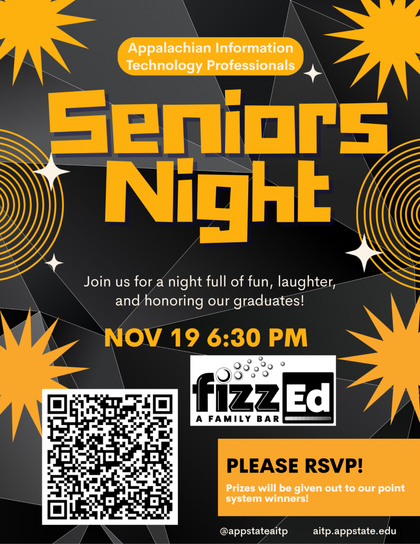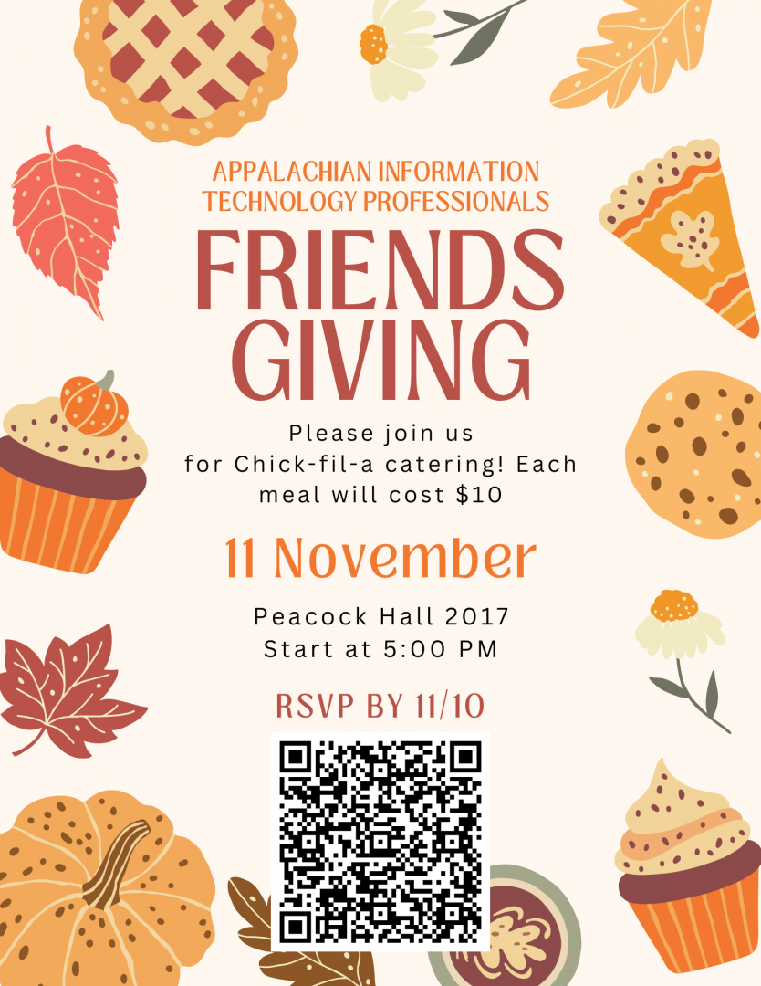 Join AppITP for our Friendsgiving celebration, featuring catering from Chic-fil-la! Bring your appetite and your friends for a cozy get-together as the fall season comes to an end. If you want to join us, please send in your RSVP, along with a payment of $10 by Monday, November 10th! You can RSVP [HERE]!